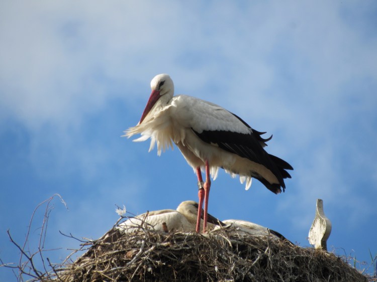 Vanaf 14 februari zat de ooievaar weer af en toe op ons dak. Vanaf 21 februari, bij verrassend warm weer, zaten de bomen in de hele straat en ons dak er weer vol mee.
