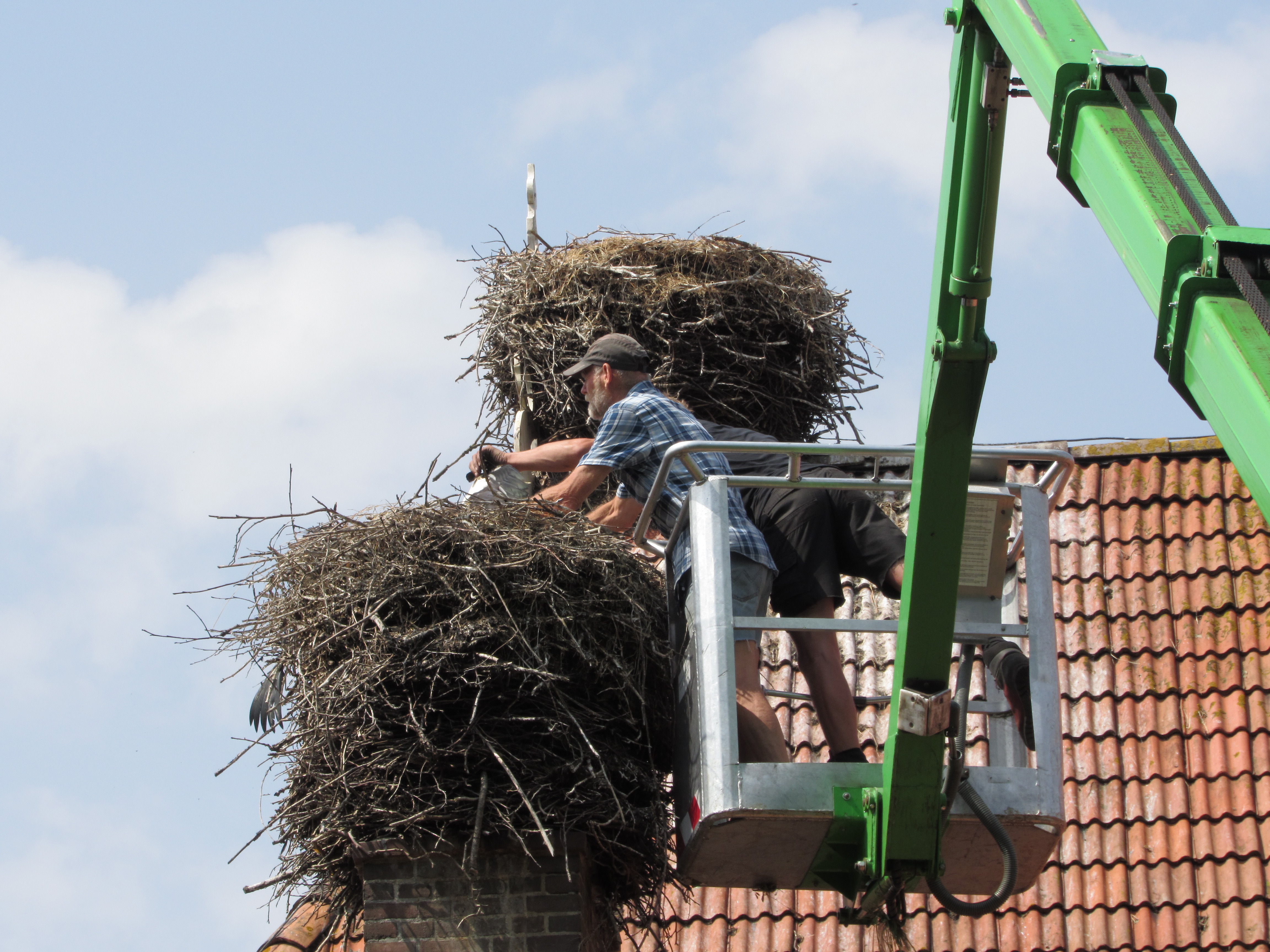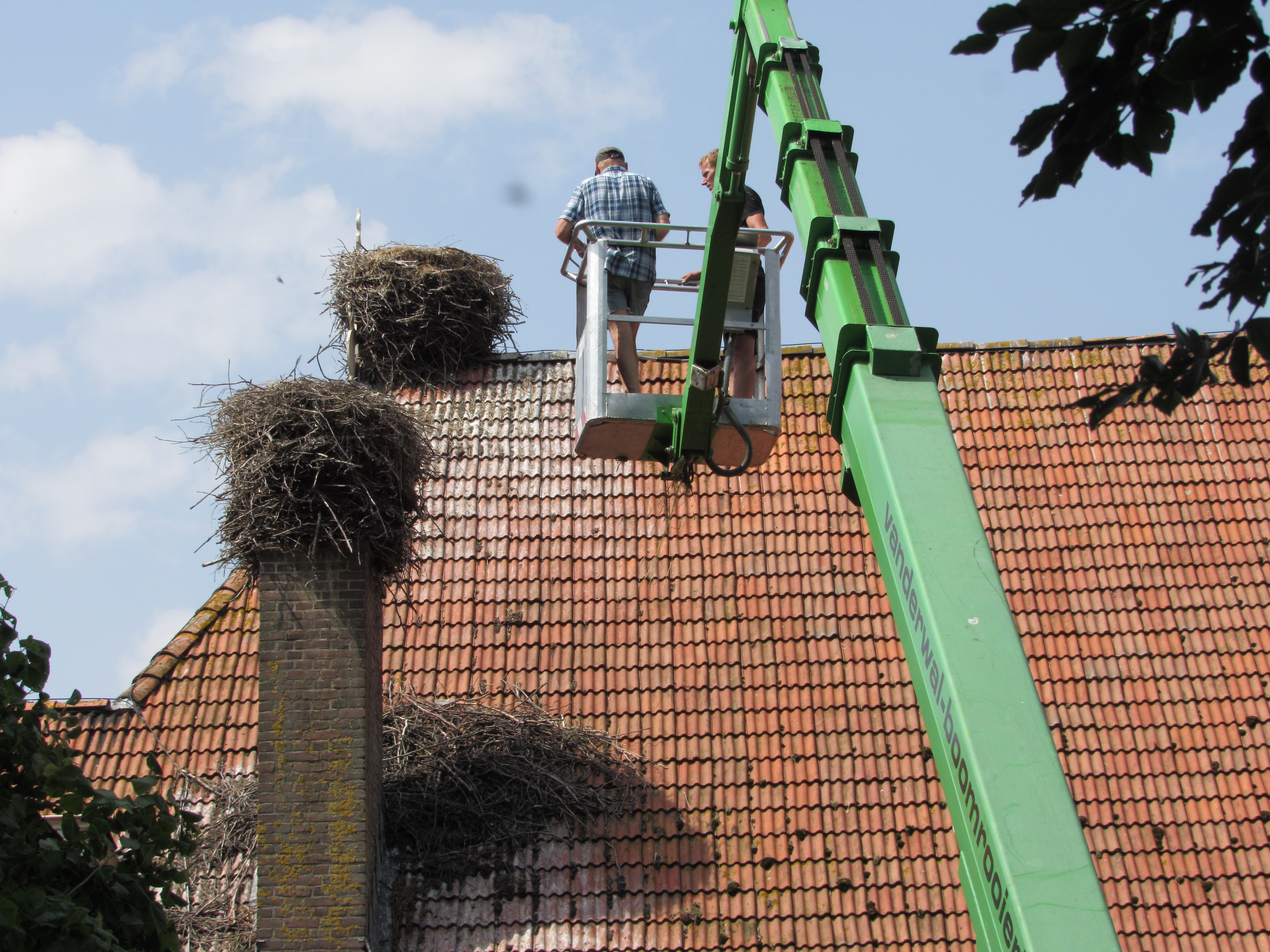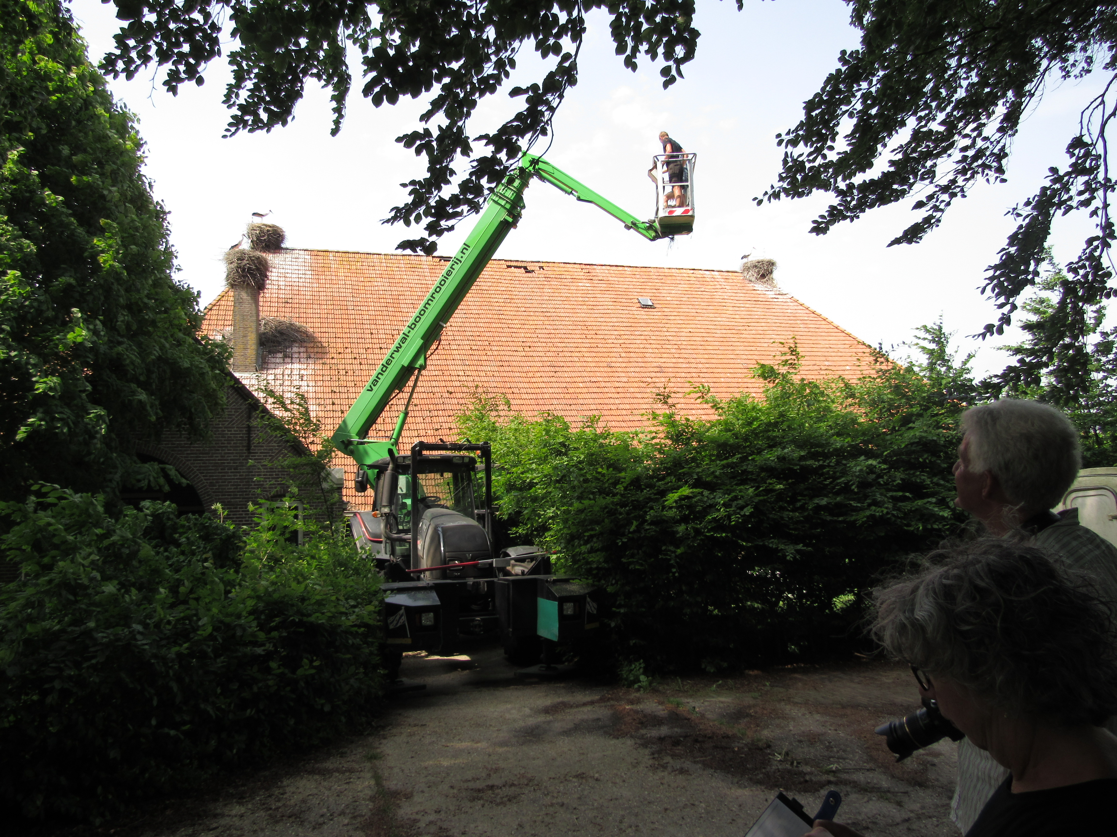 De ouders zweefden boven de nesten terwijl de onderzoekers in hun bakje de jongen ringden. De ooievaars lijken opgelucht weer op hun nesten te zitten nadat de mensen weg zijn.