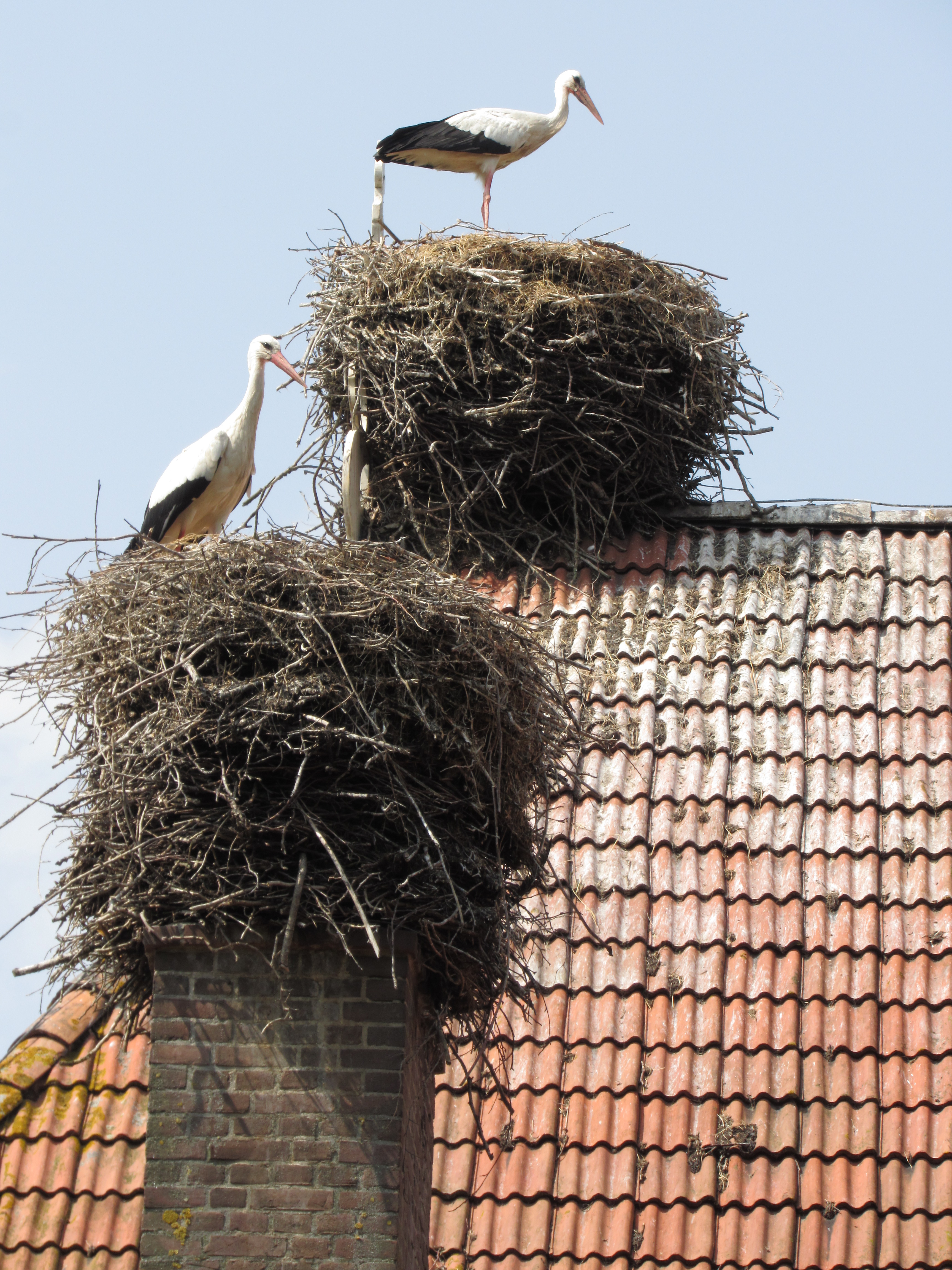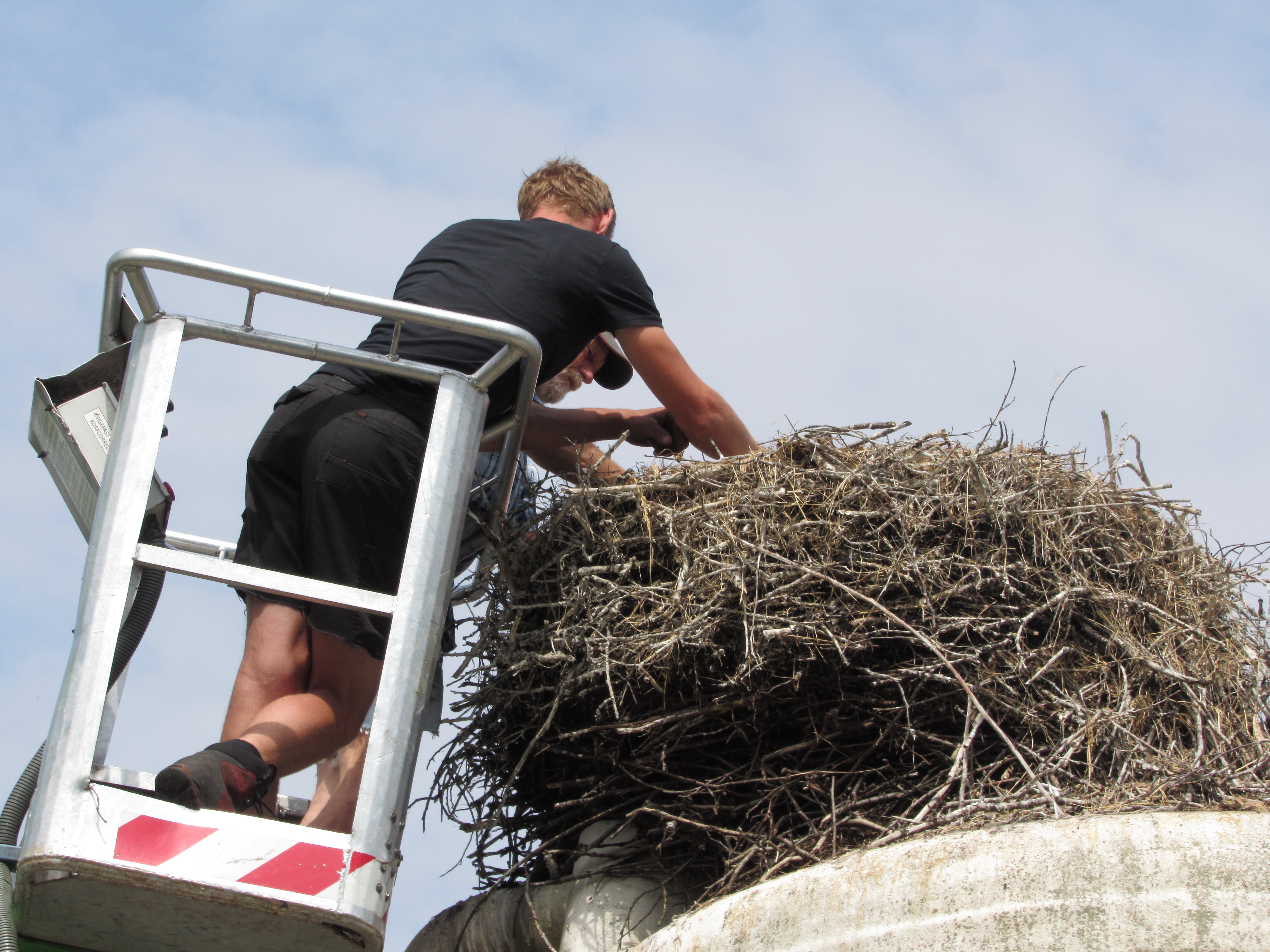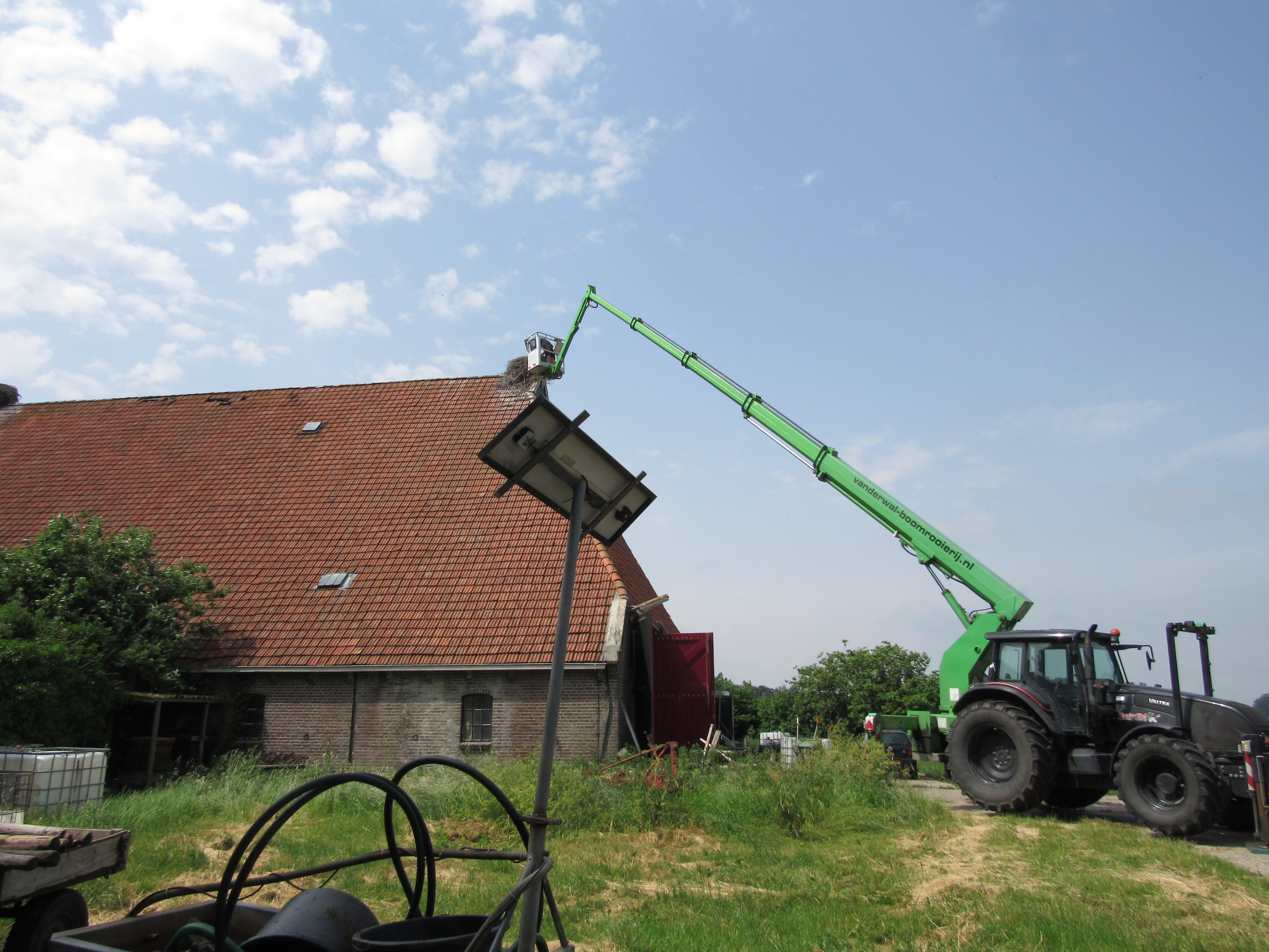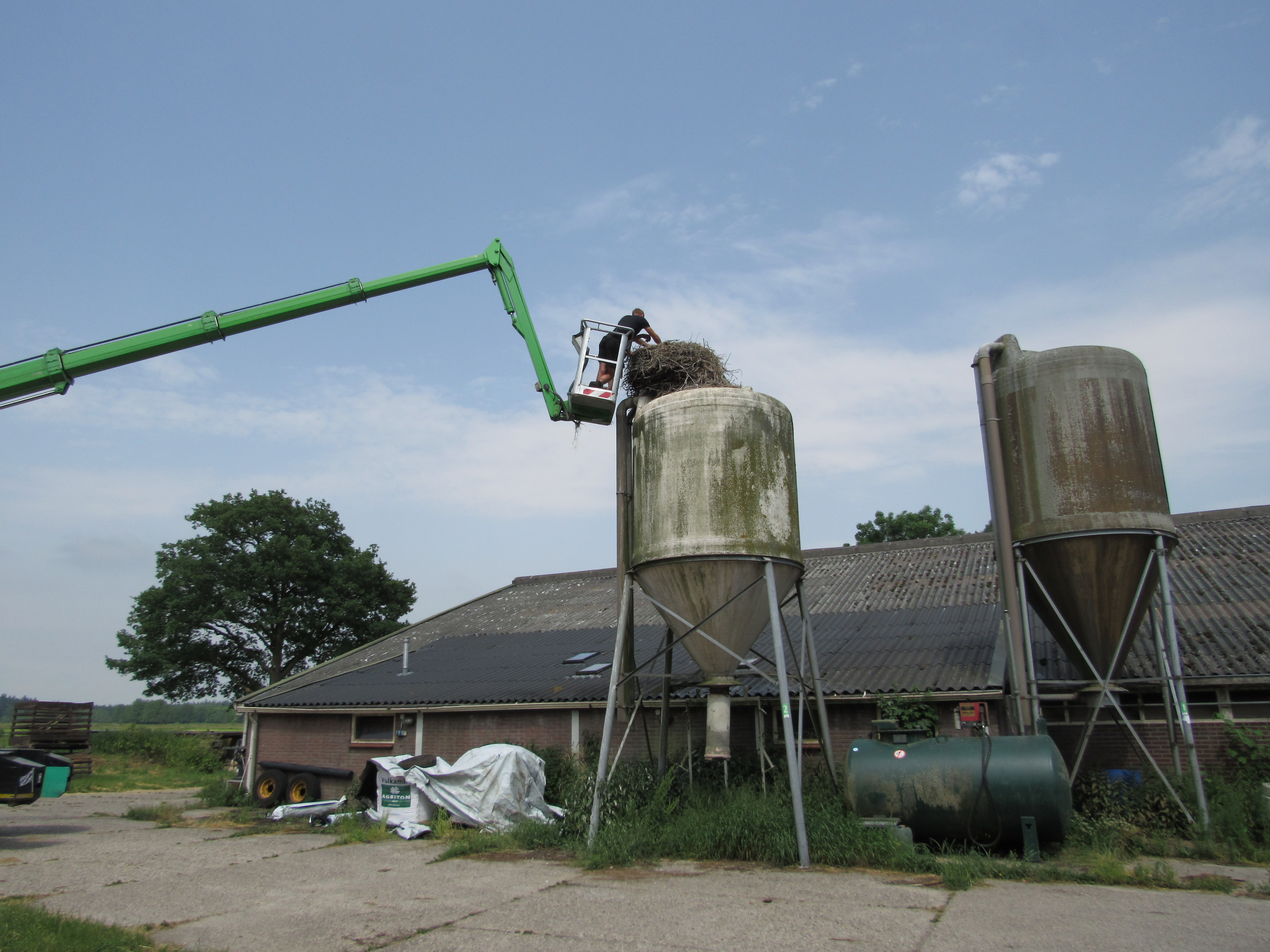De ouders zweefden boven de nesten terwijl de onderzoekers in hun bakje de jongen ringden. De ooievaars lijken opgelucht weer op hun nesten te zitten nadat de mensen weg zijn.