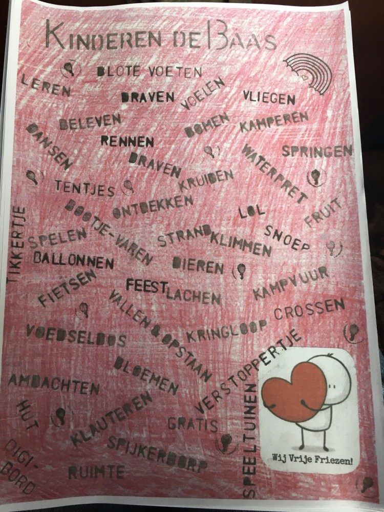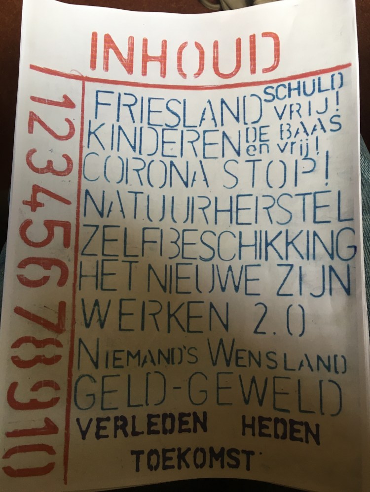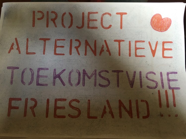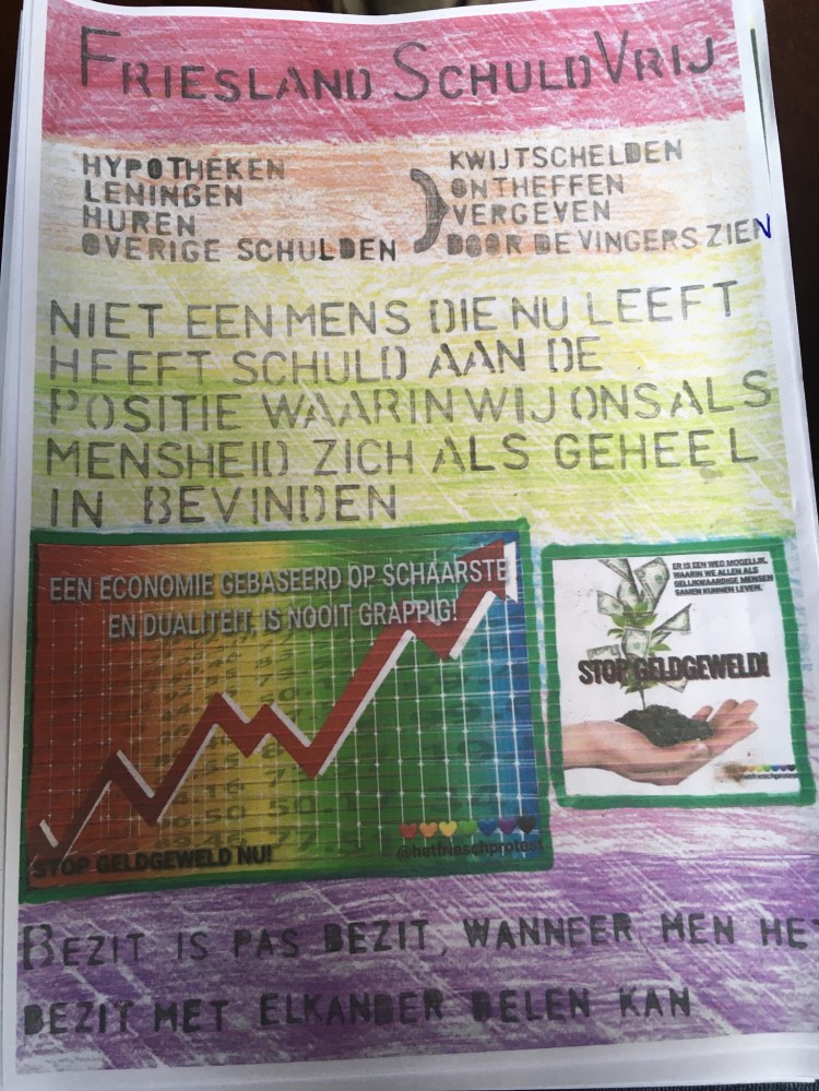 Project alternatieve toekomstvisie Friesland. Het is een losbladig geheel van A4’s vol ideeën voor de toekomst en reacties op de wereld van nu. Kinderen staan er centraal in een schuldvrije wereld. Kinderen zijn natuurlijk het symbool van de toekomst en kunnen ons veel leren. Je kunt de map met ideeën bij ons komen bekijken. Ik vraag er aandacht voor omdat het de bedoeling is dat we zelf gaan toevoegen aan het plan. Zodat het een gedeeld plan wordt. Misschien wil iemand de teksten aan elkaar schrijven of heeft hij/zij een prachtig idee, dat hier niet in mag ontbreken. Of is er discussie nodig. Hier is iemand die graag wil samenwerken aan verandering.