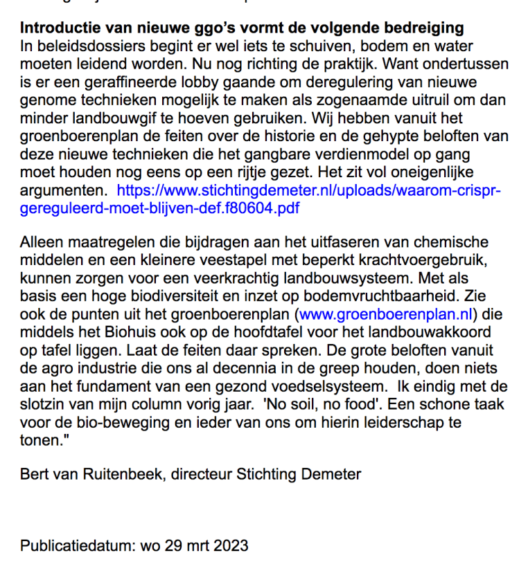 Op 29 maart schreef Bert van Ruitenbeek, de directeur van Stichting Demeter [Biojournaal] het volgende: