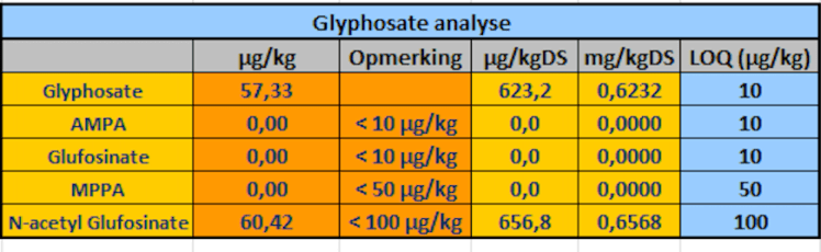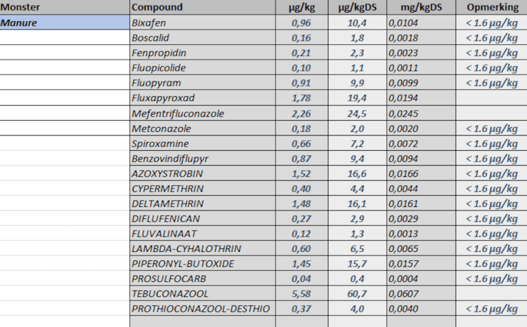 “Al die stofnamen zullen jullie collega’s helemaal niets zeggen, maar de stoffen die in de mest aanwezig zijn (maart 2024), zijn dodelijk voor de meeste insecten, de fungiciden zullen de mycorrhiza sterk reduceren die op gezonde plantenwortels leven en de herbiciden zullen de stofwisseling van de koeien zwaar belasten, want er zit extreem veel glyfosaat en glufosinaat in (afkomstig van GMO soja, mais en zonnebloemen uit Zuid-Amerika). De cocktail aan bestrijdingsmiddelen beinvloeden het microbioom in de darmen heel sterk en daarmee de gezondheid van de dieren.”