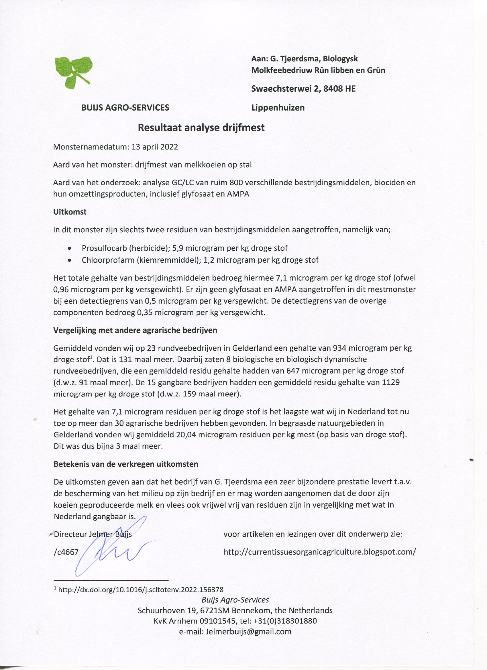 Ons bedrijf had in 2022 het schoonste mestmonster van de mest van onze koeien van dertig gemeten (natuur-)gebieden en (biologische en gangbare) veebedrijven in Nederland.