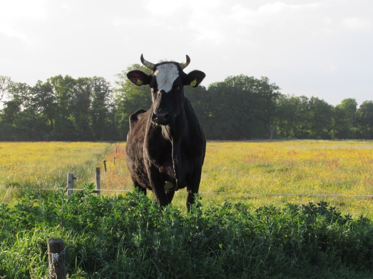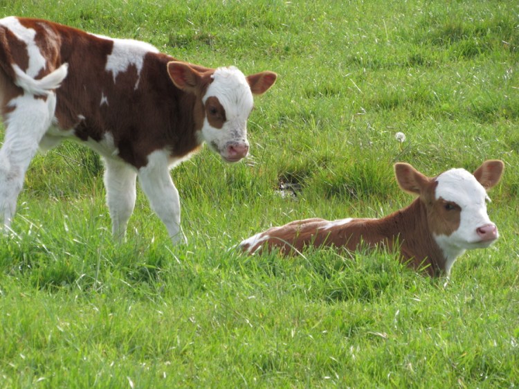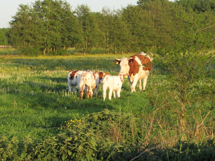 De koeien houden bij ons hun hoorns; ze lopen dag en nacht in de wei zolang het seizoen het toelaat (dus dat het gras niet wordt vertrapt). We genieten van kalfjes die met de koeien meelopen en zien hoe het koppel vee ervan opleeft.