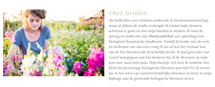 Biologische snijbloemen, bijvoorbeeld, dat vind ik een serieus onderwerp. Bloemen liggen ons na aan het hart. Wat doen pesticiden op bloemen met ons, onze kinderen en huisdieren? De vrouw hieronder genoemd verkoopt pesticide-vrije bloemen. Zoek deze mensen op en steek je licht op bij winkeliers en telers: “Wat ga jij doen aan de vergiftiging van ons milieu? En hoe kan ik jou ermee helpen?” Om die vraag draait het. Bij Huiberts Bloembollen kun je in ieder geval bollen zonder bestrijdingsmiddelen kopen. Kijk op deze site voor biologische sierteelt waar je nog meer terechtkunt of ga zelf biologische snijbloemen verkopen.